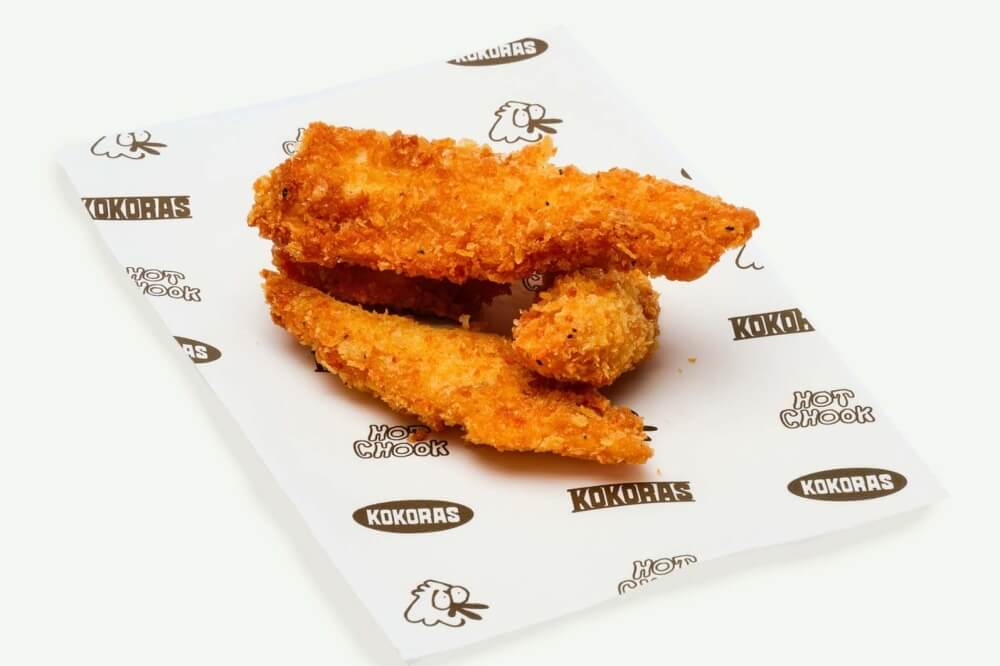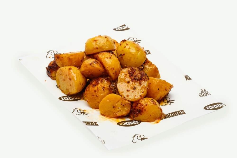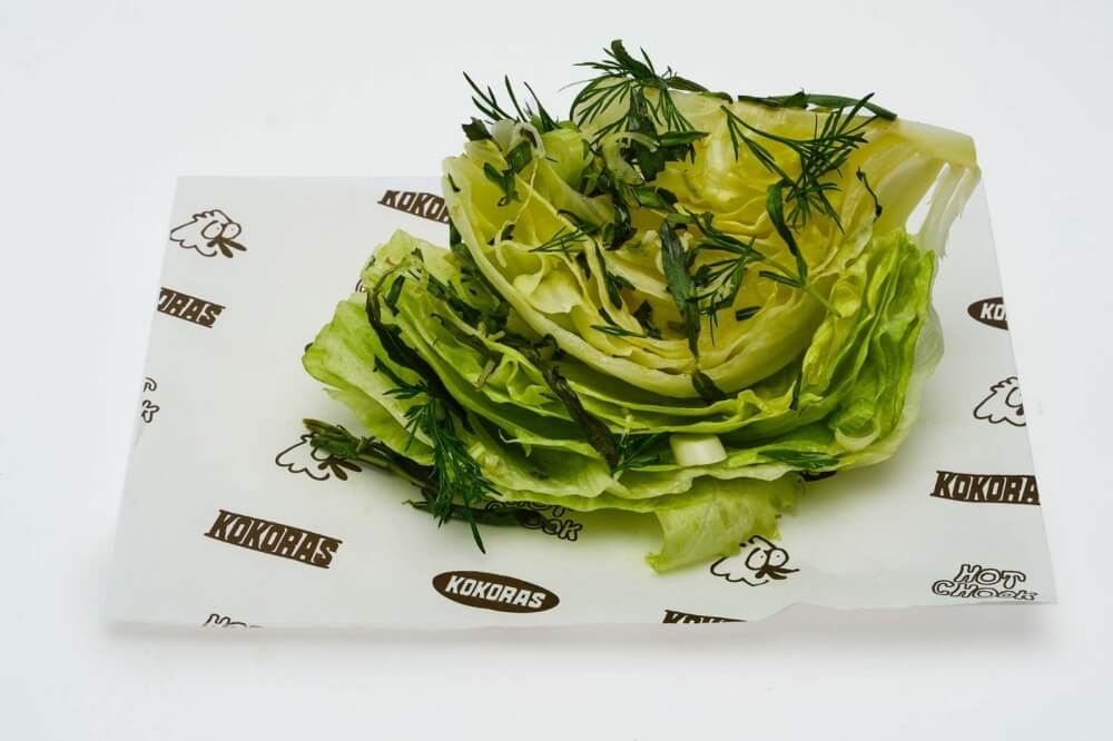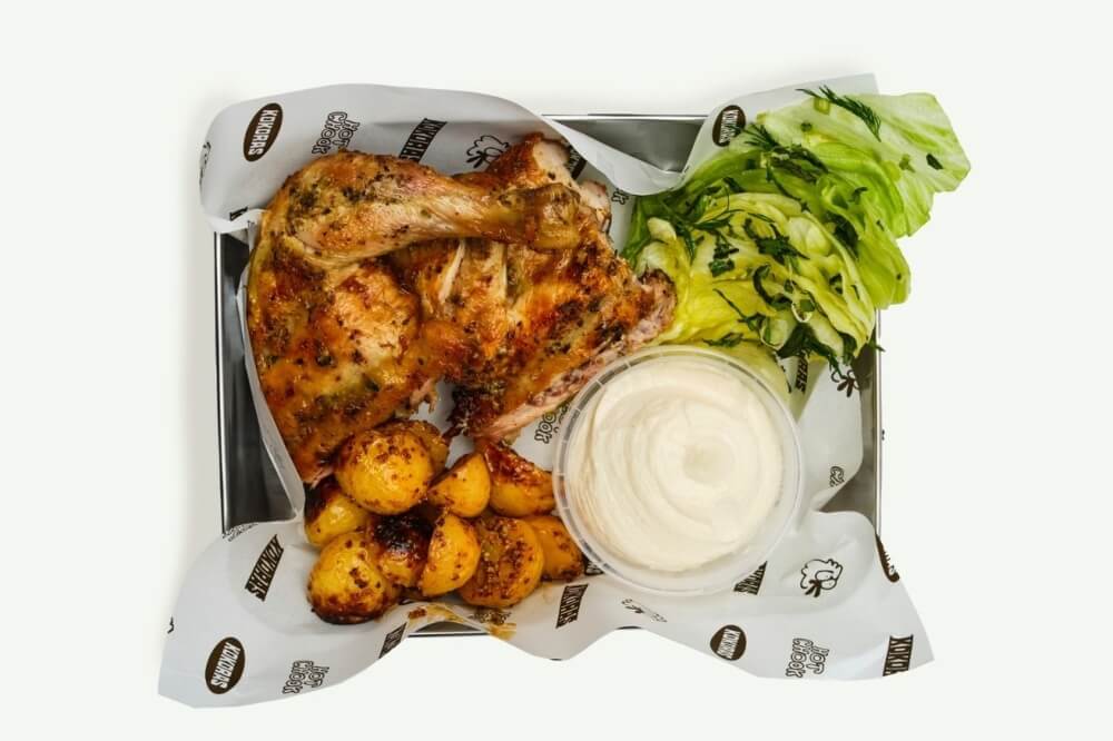 Chicken, lemon potatoes, iceberg salad, tarama.