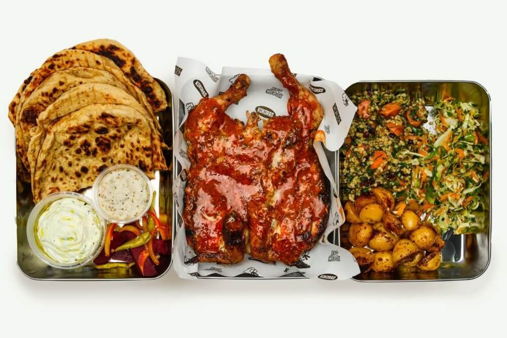 Whole chicken, 4 flatbread, tzatziki and lemon oregano sauce, carrot salad, politiki salad, pickles, roasted potatoes.