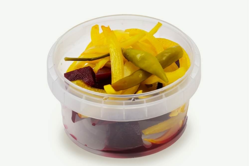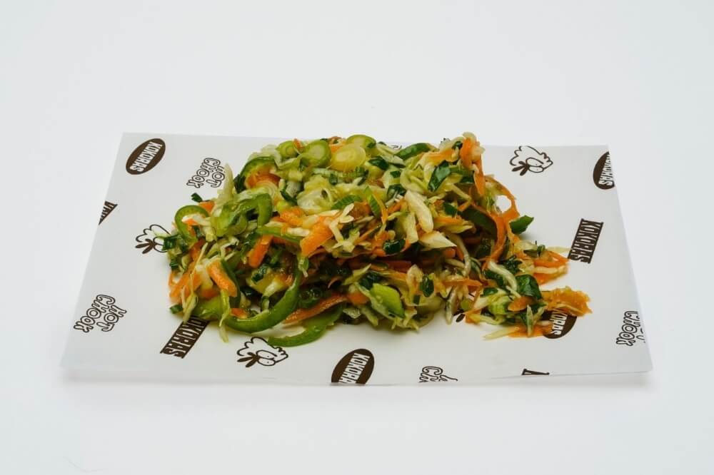 Chicken, pickles, carrot salad, tzatziki, flatbread.